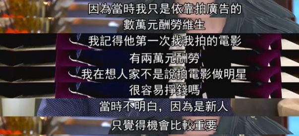 据她回忆,她参与拍摄的第一部影片结束之后,收到的报酬足足有两万港币,这相当于她在广告公司的月薪。
